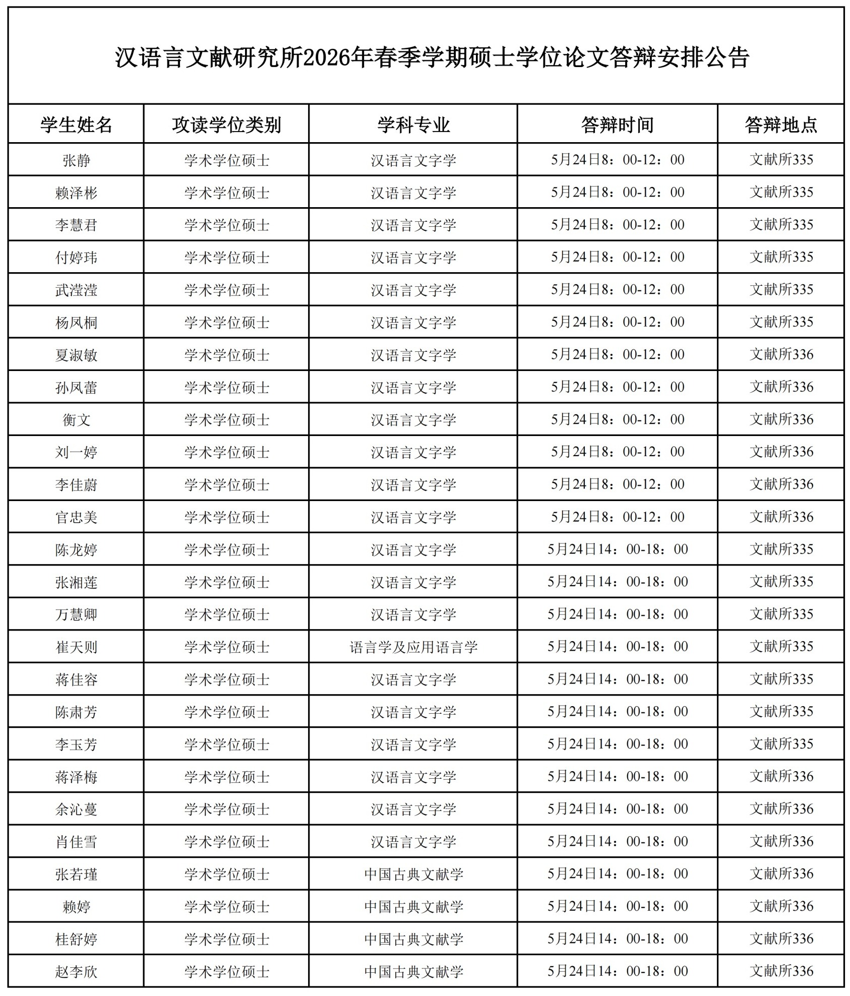 我所2026年春季学期硕士学位论文答辩会将于2026年5月24日(周日)举行,具体安排如下: